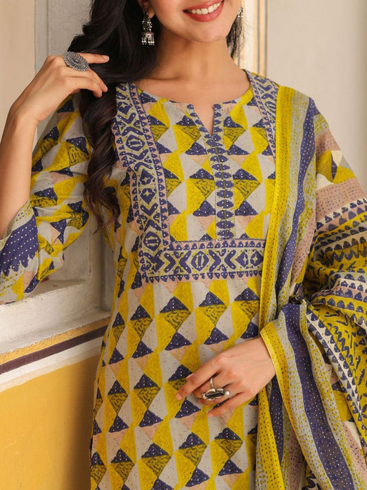 Dhiyona RR Women's Geometric Printed Pure Cotton Straight Kurta With Trousers & Dupatta