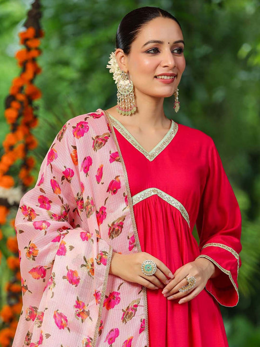 Dhiyona IN Floral Embroidered A-Line Kurta with Trousers & Dupatta