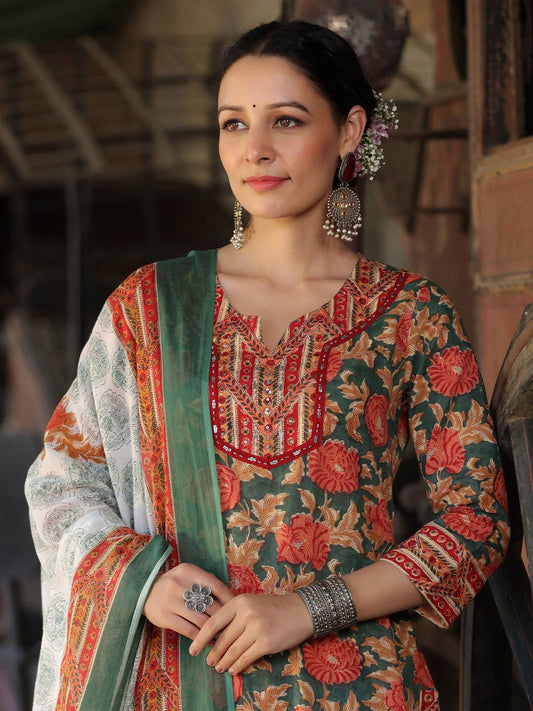Dhiyona RR Women's Floral Printed Mirror Work Pure Cotton Kurta with Trousers & Dupatta