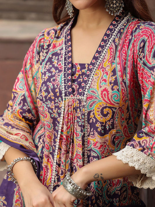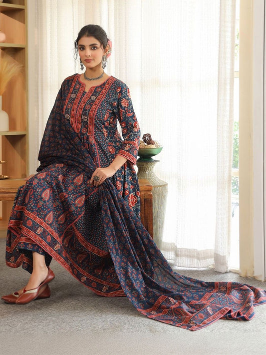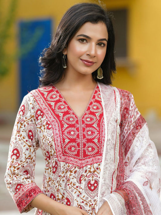 Dhiyona RR Women's Paisley Printed Thread Work Pure Cotton Kurta with Trousers & Dupatta