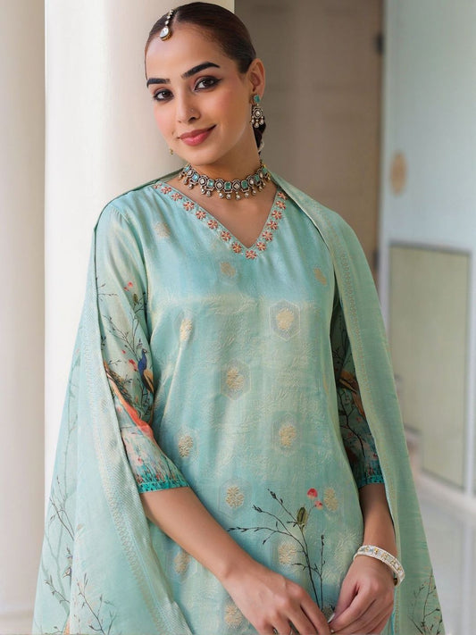 Dhiyona IN Woven Design V Neck A Line Chanderi Silk Kurta With Trousers & Dupatta
