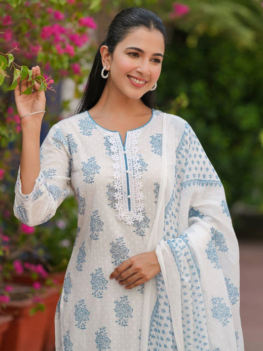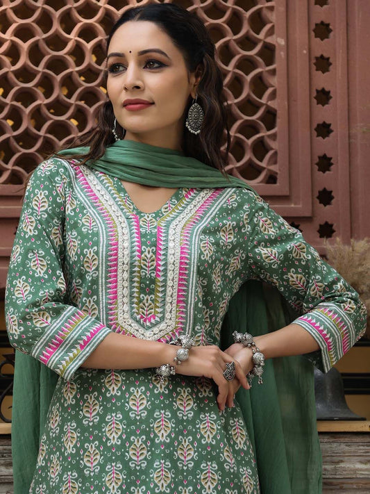 Dhiyona RR Women's Printed Notch Neck Pure Cotton Straight Kurta With Trousers & Dupatta