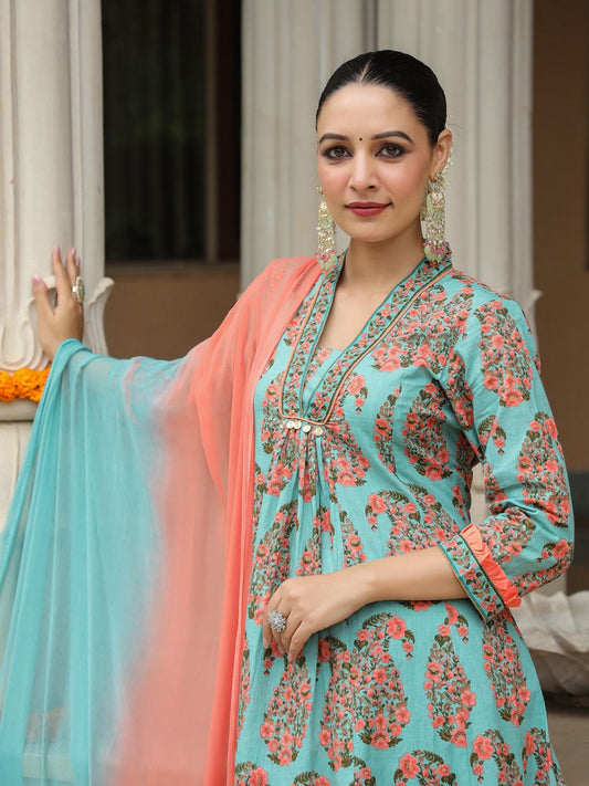 Dhiyona RR Women's Floral Printed Bell Sleeves Pure Cotton Kurta With Trousers & Dupatta