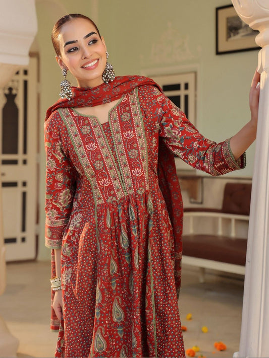 Dhiyona RR Women's Ethnic Motifs Printed Pleated Pure Cotton Kurta with Trousers & With Dupatta