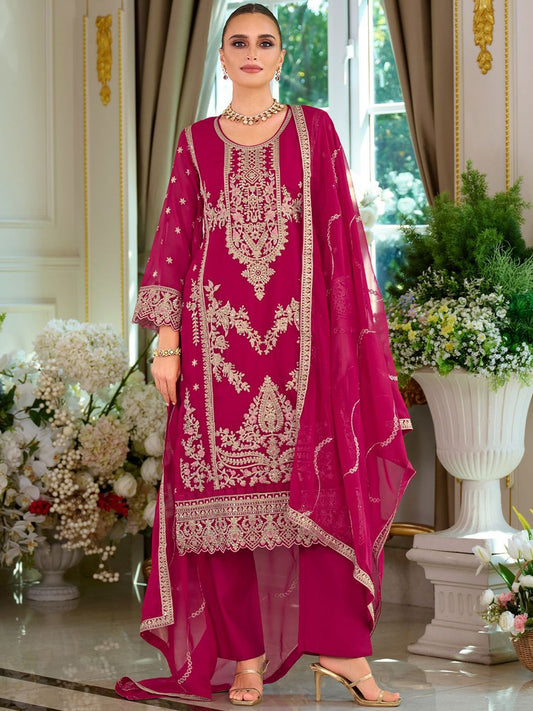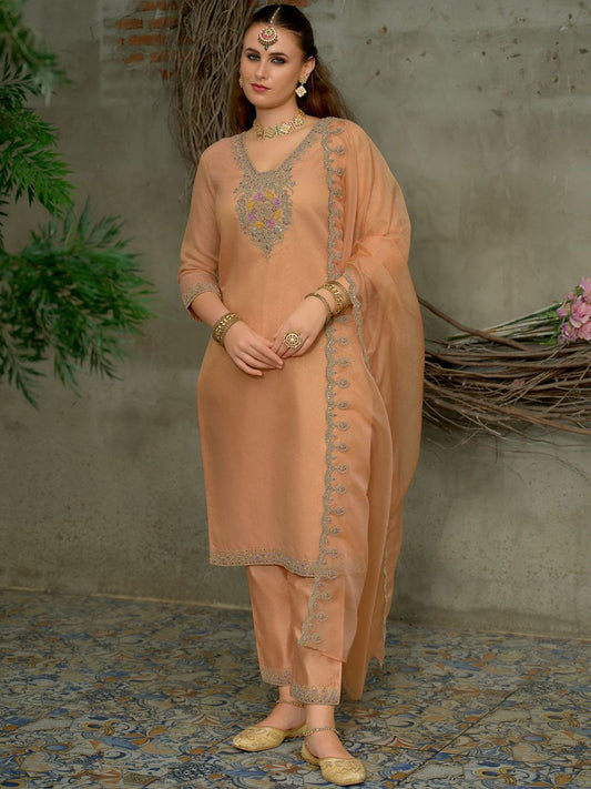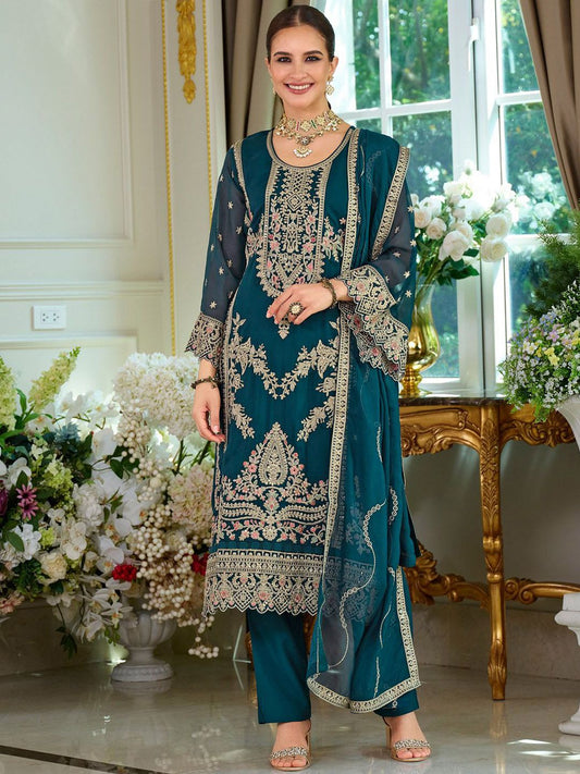 Dhiyona IE Women's Ethnic Motifs Embroidered Zari Organza Straight Kurta & Trousers With Dupatta