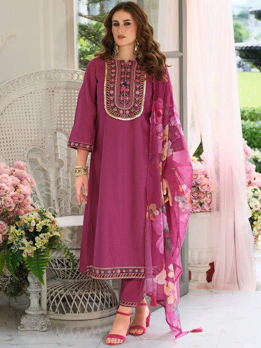 Dhiyona IE Women's Ethnic Motifs Embroidered Thread Work Liva Straight Kurta With Trousers & Dupatta