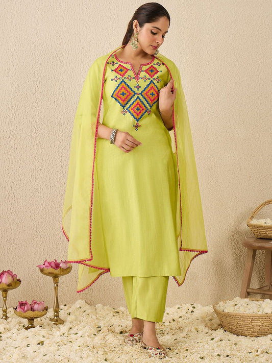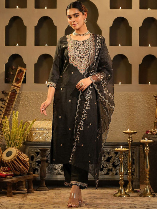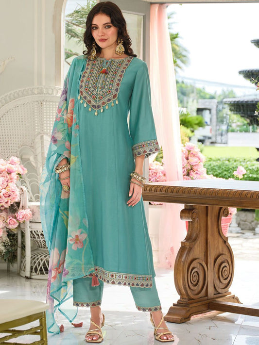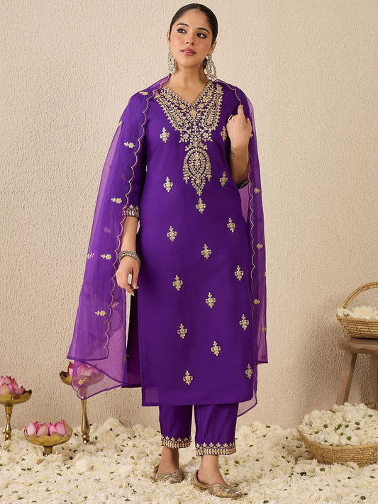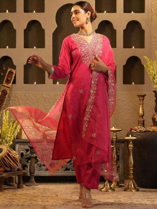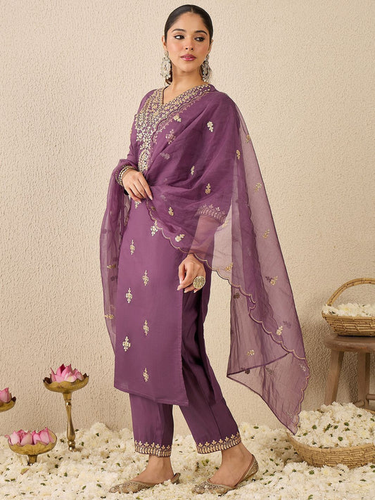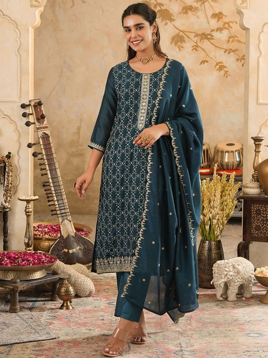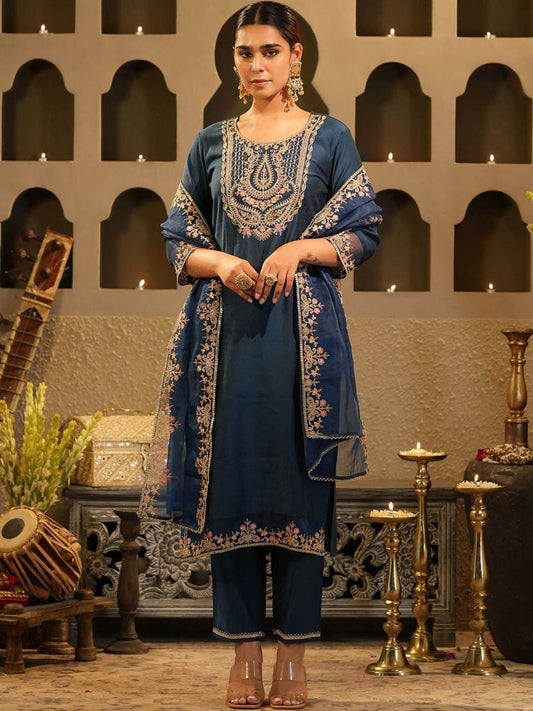 Dhiyona VV Women's Embroidered Silk Blend Calf Length Straight Kurta Trouser with Dupatta Set