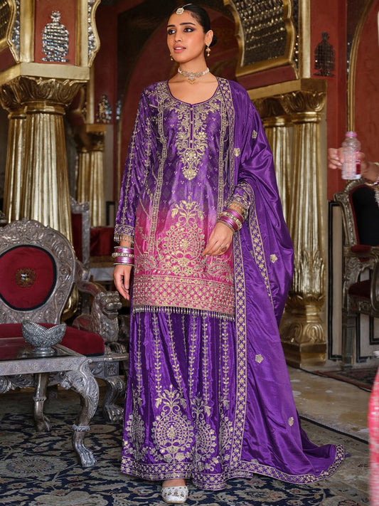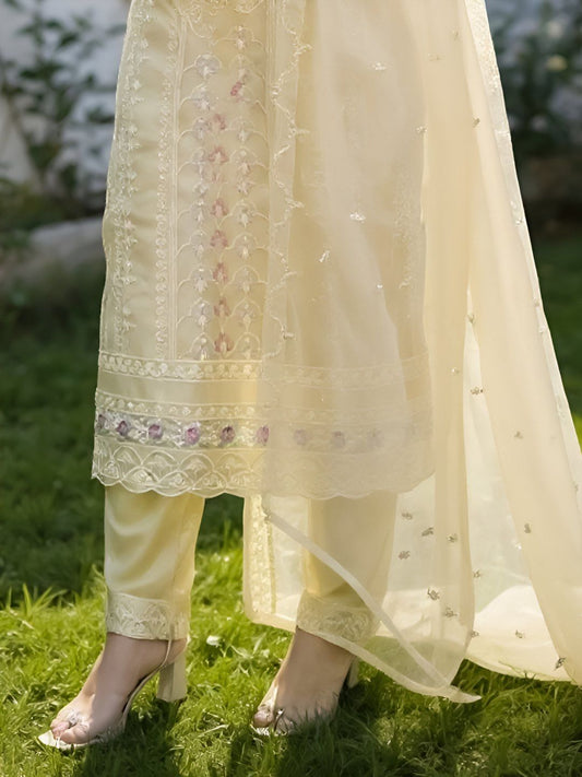 Dhiyona IE Women's Floral Embroidered Thread Work Organza Kurta With Trousers & Dupatta