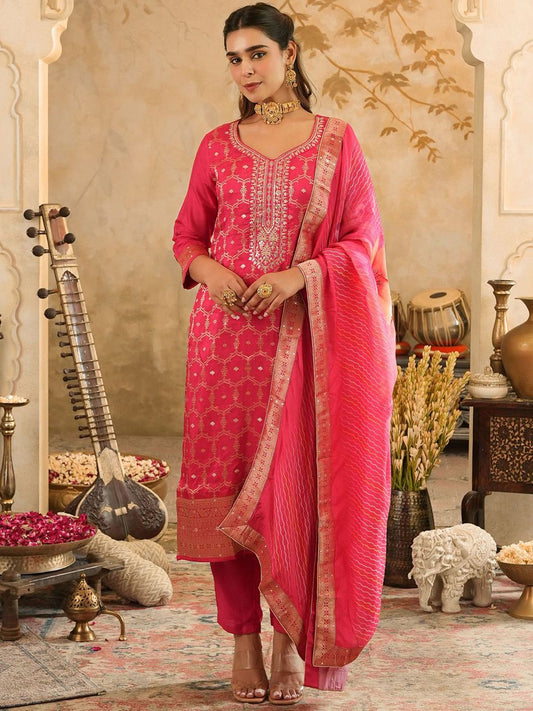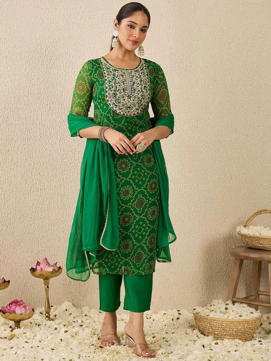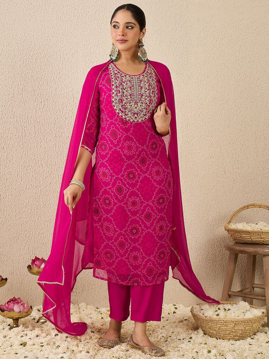 Dhiyona IE Women's Bandhani Printed Thread Work Straight Kurta With Trousers & Dupatta