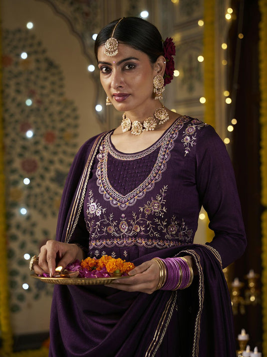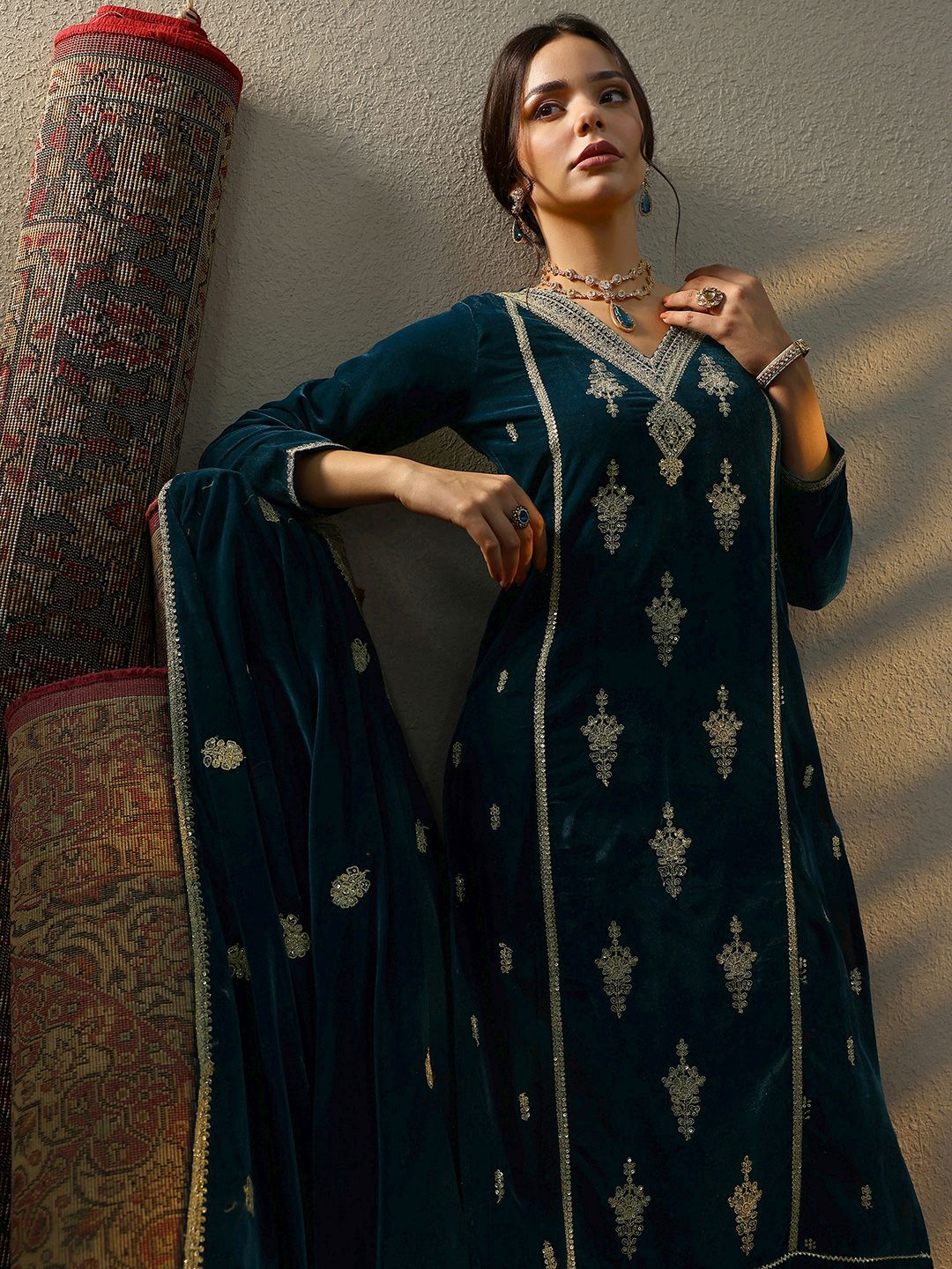 Dhiyona CH Women Ethnic Motifs Embroidered Regular Velvet Kurta with Trousers & With Dupatta