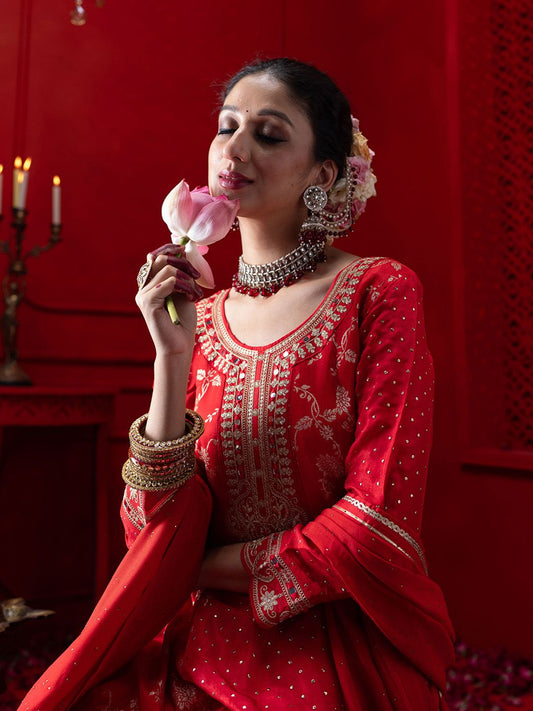 Dhiyona IN Floral Yoke Design Sequinned Anarkali Kurta With Palazzos & Dupatta