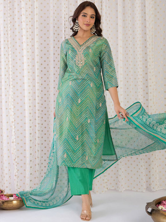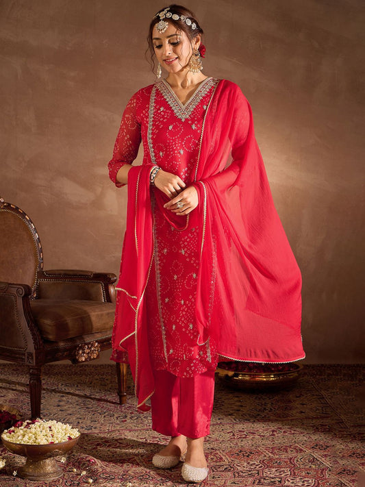 Dhiyona IE Bandhani Printed V-Neck Zari Silk Chiffon Straight Kurta With Trousers & Dupatta