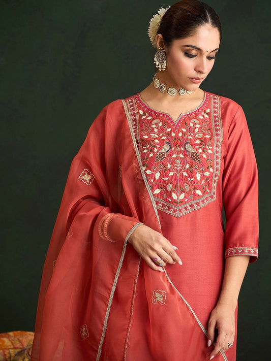 Dhiyona IE Women Orange Floral Embroidered Regular Chanderi Silk Kurta with Palazzos