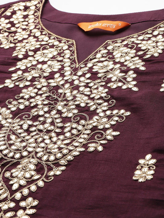 Buy 2 Get 1 FreeVendor:Dhiyona GFWomen's Deep Purple Golden Embroidered Raw Silk Salwar Suit With Silk Organza Dupatta
