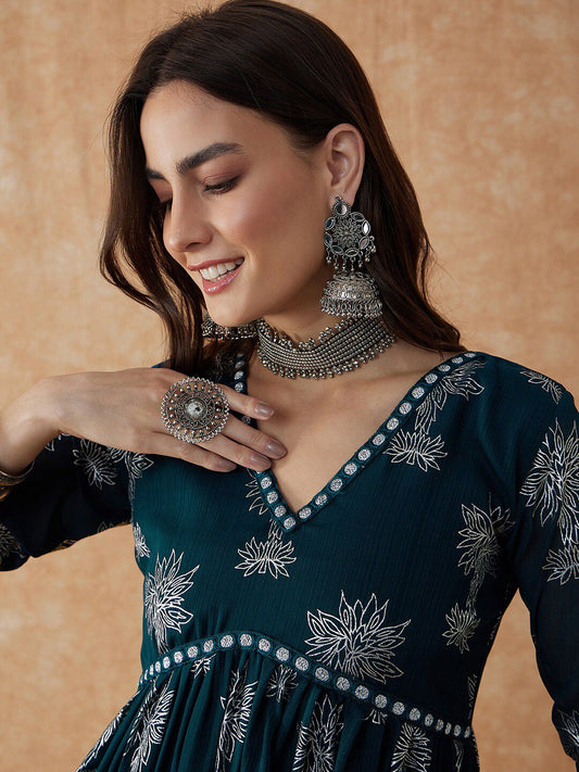 Buy 2 Get 1 FreeVendor:Dhiyona SNDhiyona SN Women's Teal Blue Embroidered Zari Sequence A Line Kurta & Trousers Dupatta