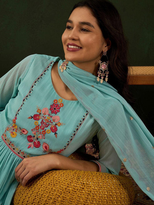 Buy 2 Get 1 FreeVendor:Dhiyona SNDhiyona SN Women's Blue Floral Embroidered Zari Sequince Anarkali Kurta With Trousers And Dupatta