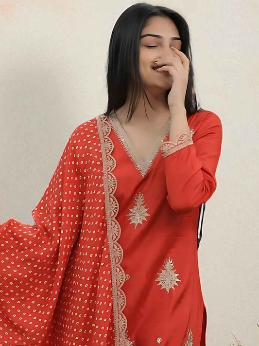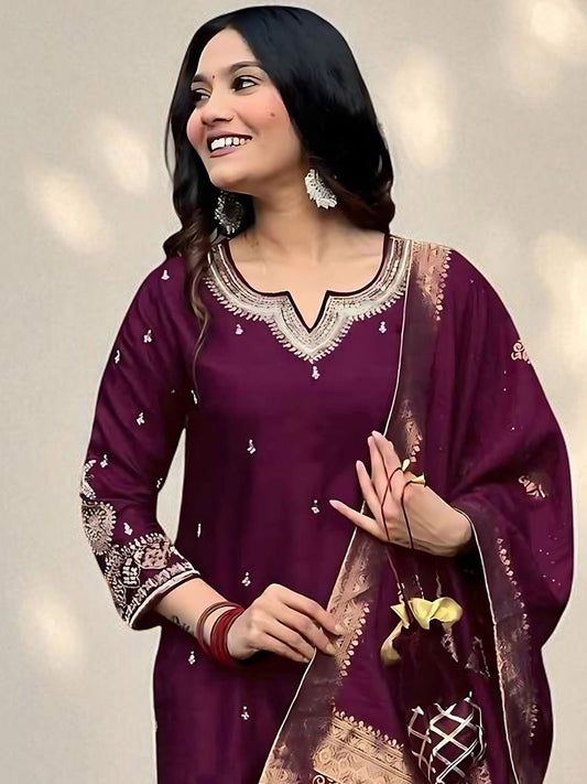 Dhiyona SN Women's Zari Sequence Embroidered Straight Velvet Kurta Trousers With Dupatta