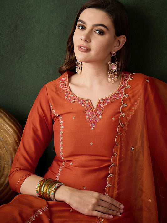 Buy 2 Get 1 FreeVendor:Dhiyona VADhiyona VA Women'sFloral Yoke Design Sequinned Dupion Silk Straight Kurta with Trouser & Dupatta