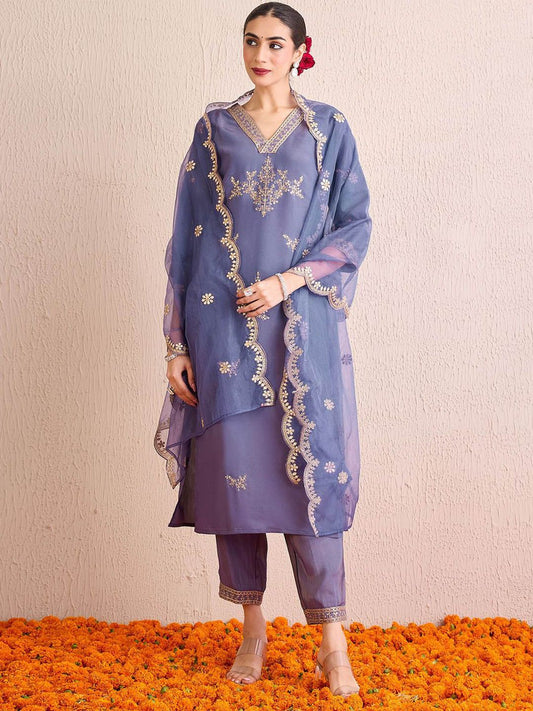 Buy 2 Get 1 FreeVendor:Dhiyona SNDhiyona SN Women's Purple Floral Embroidered V-Neck Sequinned Straight Kurta With Trouser & Dupatta
