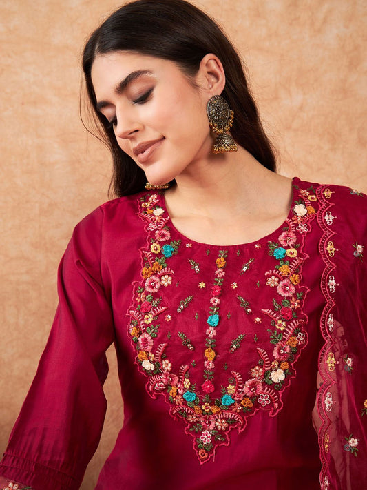 Dhiyona IE Floral Embroidered Kurta With Trousers & Dupatta