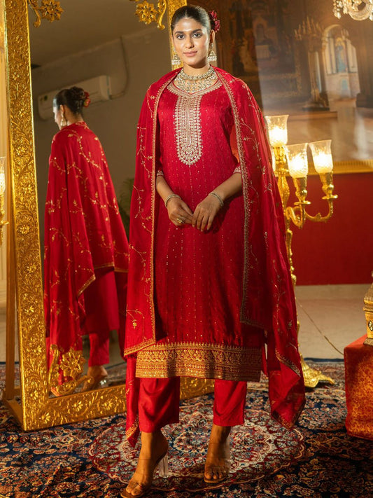 Women's Red Crepe A-line Kurta with Palazzo And Dupatta