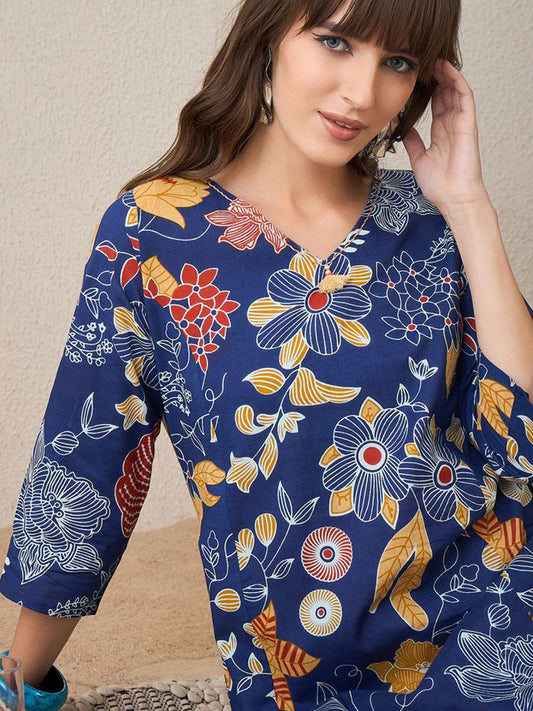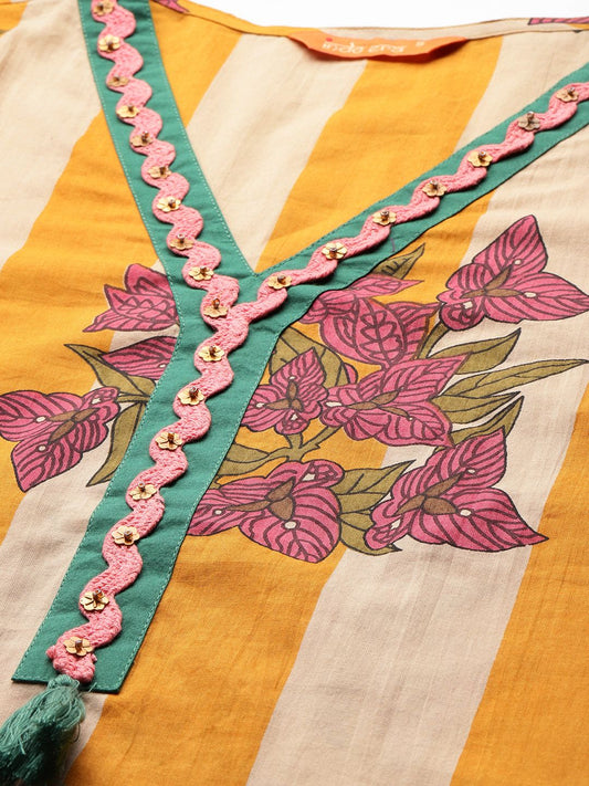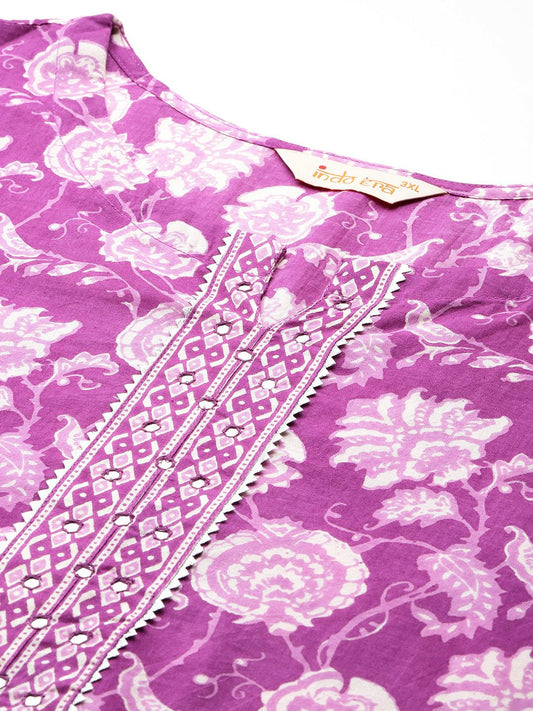 Dhiyona IE Plus Size Floral Printed Mirror Work Pure Cotton Kurta Set