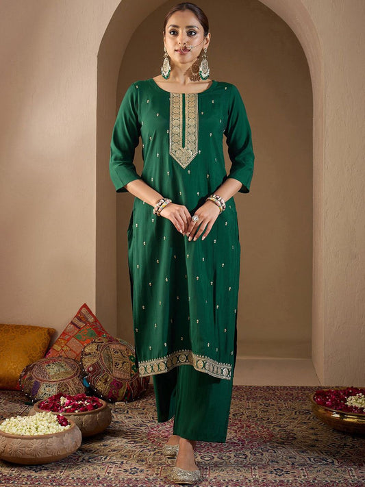 Buy 2 Get 1 FreeVendor:Dhiyona IEDhiyona IE Women Ethnic Motifs Embroidered Sequinned Pure Cotton A-Line Kurta with Trousers