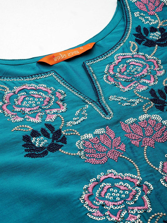 Buy 2 Get 1 FreeVendor:Dhiyona IEDhiyona IE Women Teal Floral Embroidered Regular Thread Work Kurta with Trousers & With Dupatta