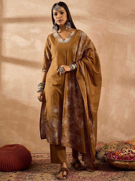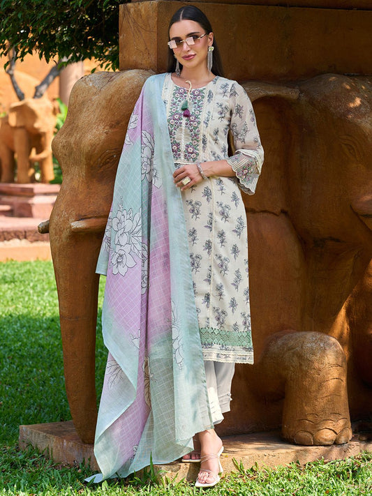 Dhiyona IE Floral Printed Regular Thread Work Pure Cotton Kurta with Trousers & With Dupatta