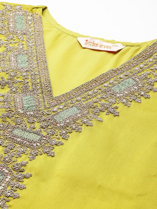 Dhiyona IE Notched Neck Ethnic Motifs Embroidered Liva Kurta with Trouser & Dupatta