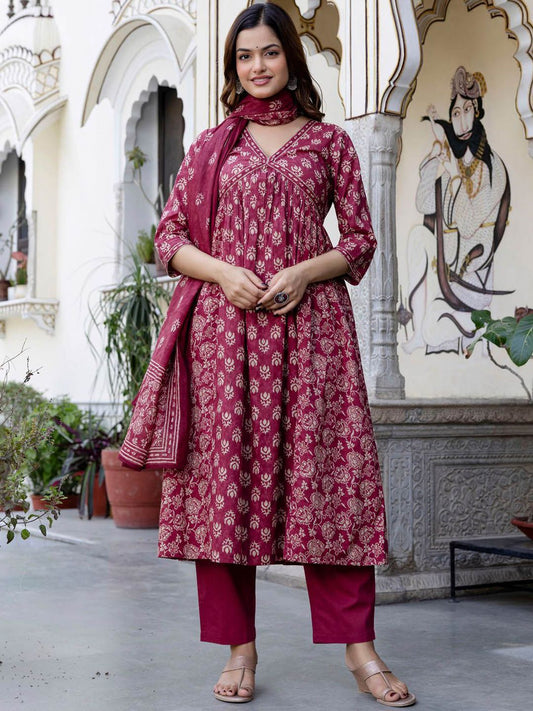 Dhiyona IE Floral Printed Empire Pure Cotton Kurta with Trousers & With Dupatta