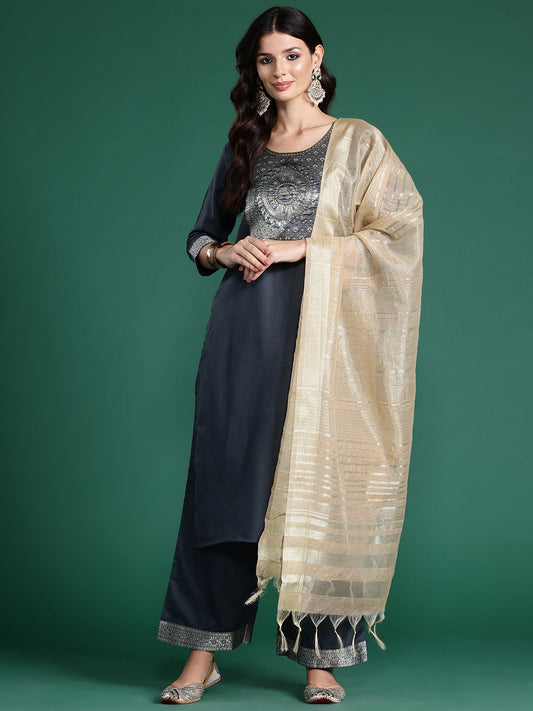 Dhiyona IE Ethnic Motifs Yoke Design Straight Zari Liva Kurta with Trousers & Dupatta