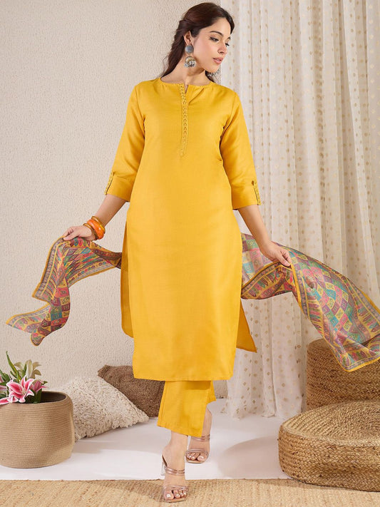 Dhiyona IE Ethnic Motifs Embroidered Thread Work Straight Kurta With Trousers & Dupatta