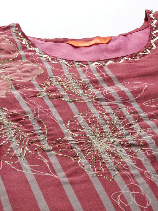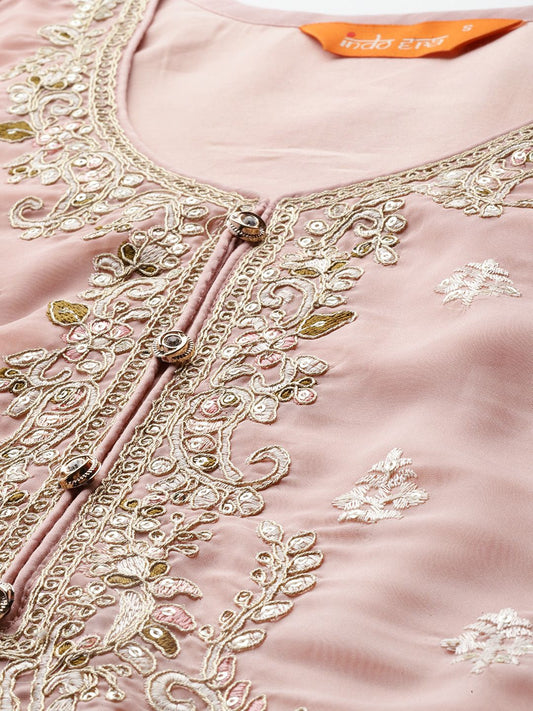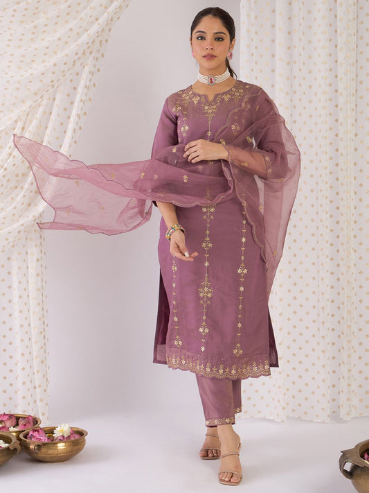 Dhiyona IE Floral Embroidered Sequinned Chinon Straight Kurta With Trousers & Dupatta