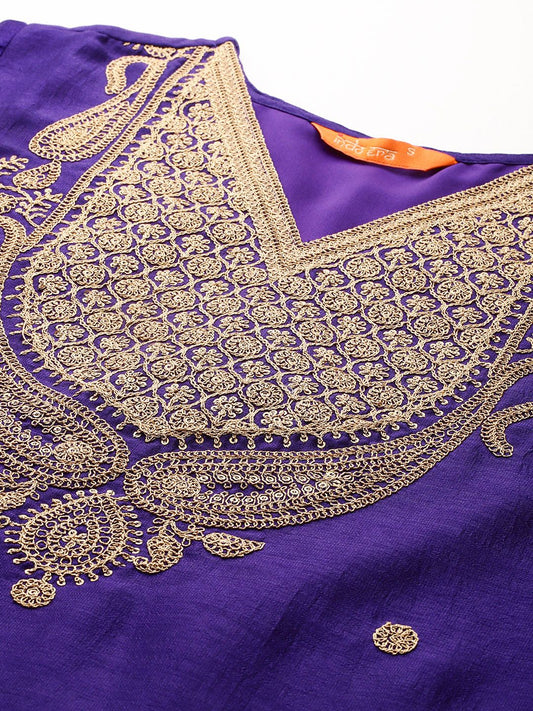 Dhiyona SN Women's Purple Floral Embroidered Mirror Work A-Line Kurta With Trouser And Dupatta