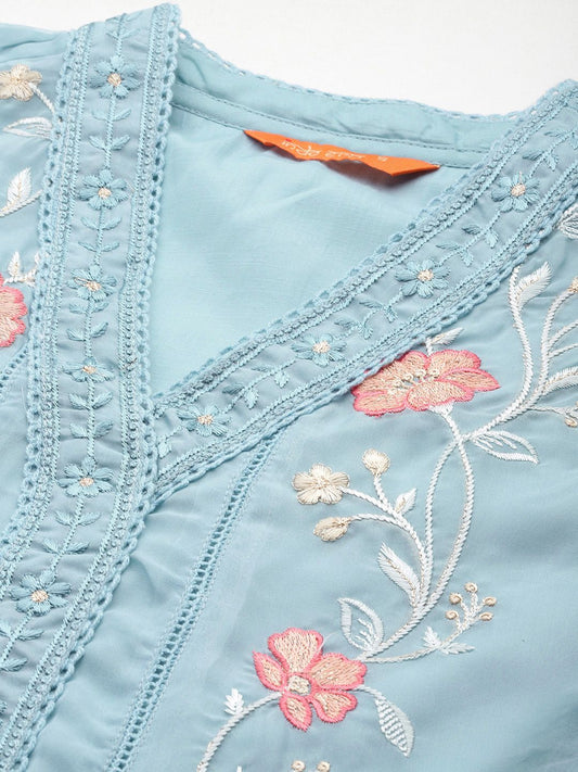 Dhiyona SN Women's Floral Embroidered Notch Neck Kaftan Kurta & Trousers