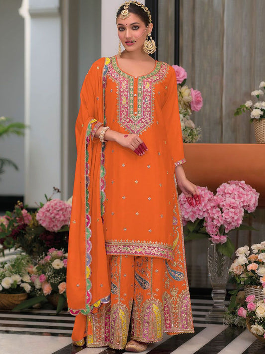 Buy 2 Get 1 FreeVendor:Dhiyona IEDhiyona IE Floral Embroidered Sequinned Chinon Straight Kurta With Palazzos & Dupatta
