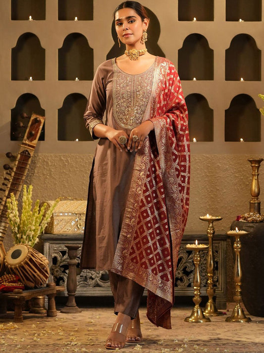 Dhiyona IE Women's Floral Yoke Design Round Neck Zari Straight Kurta & Trousers With Dupatta