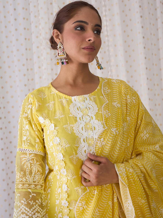 Dhiyona IE Round Neck Floral Embroidered Pure Cotton Straight Kurta with Trouser & Dupatta