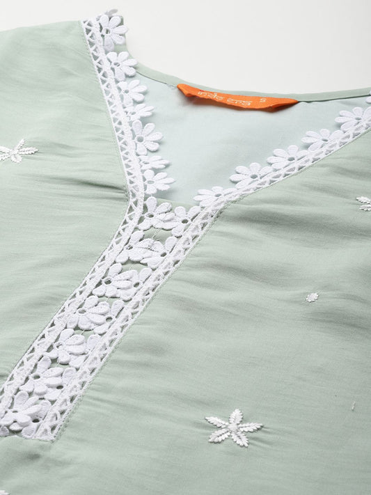 Dhiyona IE Floral Yoke Design Thread Work A-Line Liva Kurta With Trousers