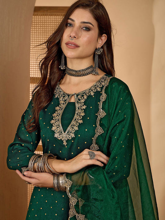 Dhiyona IE Women's Ethnic Motifs Embroidered Zari Organza Straight Kurta & Trousers With Dupatta