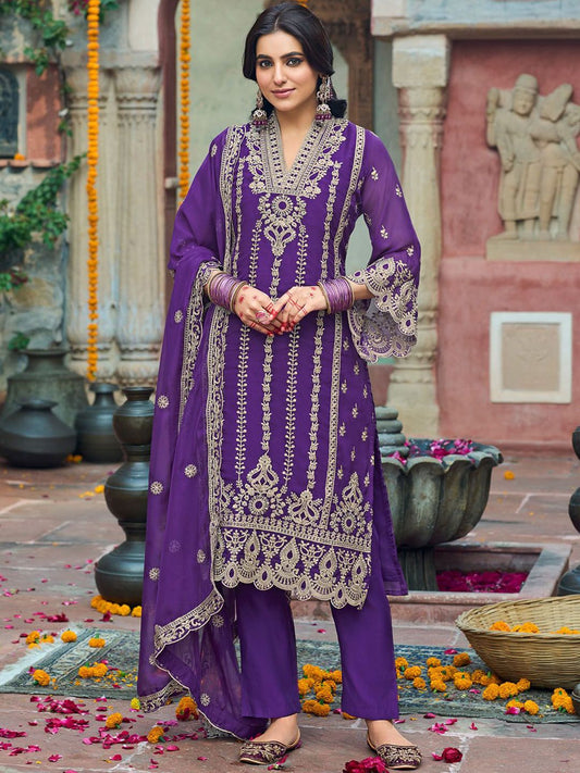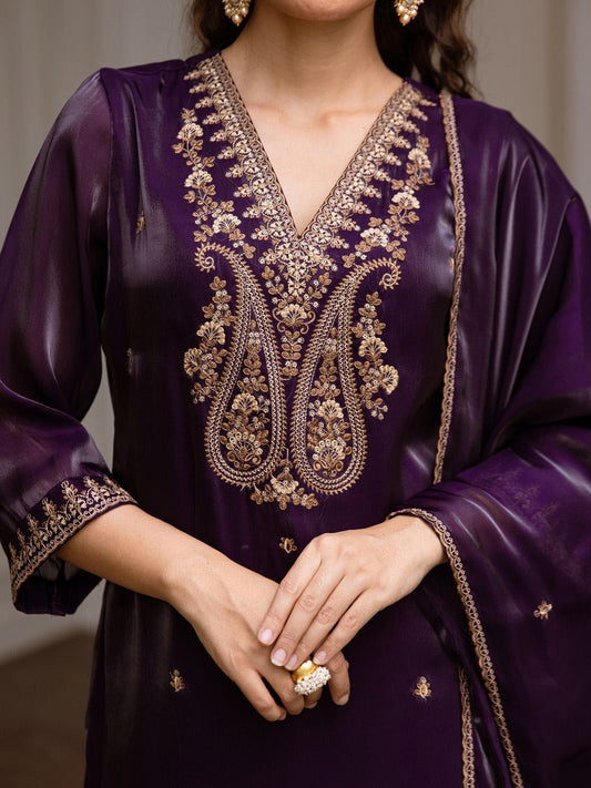 Dhiyona IE Floral Embroidered V-Neck Zari Organza Straight Kurta With Trousers And Dupatta