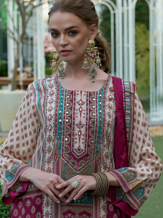 Dhiyona IE Ethnic Motifs Printed Mirror Work Pure Silk A-Line Kurta & Palazzos With Dupatta