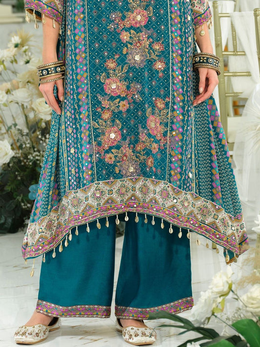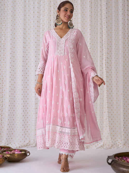 Dhiyona IE Floral Embroidered Mirror Work Round Neck Anarkali Kurta With Palazzos & Dupatta