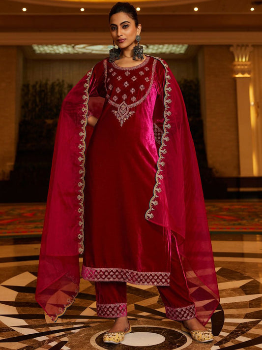 Dhiyona IE Women Ethnic Motifs Embroidered Regular Velvet Kurta with Trousers & With Dupatta