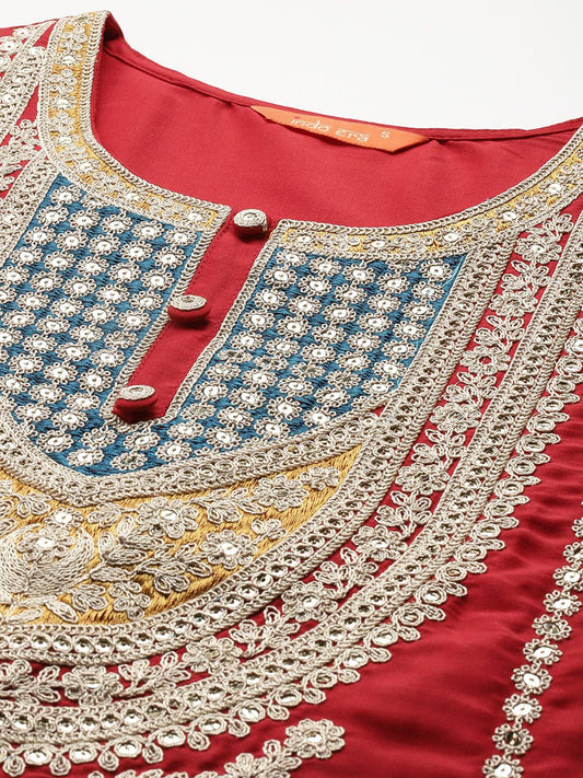 Dhiyona IE Maroon Floral Yoke Design Thread Work Straight Kurta & Trousers With Dupatta