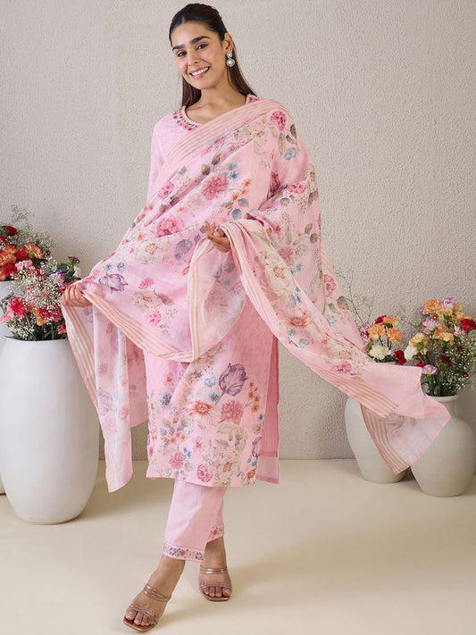 Dhiyona IE Floral Printed V-Neck Pure Cotton Straight Kurta With Trousers & Dupatta