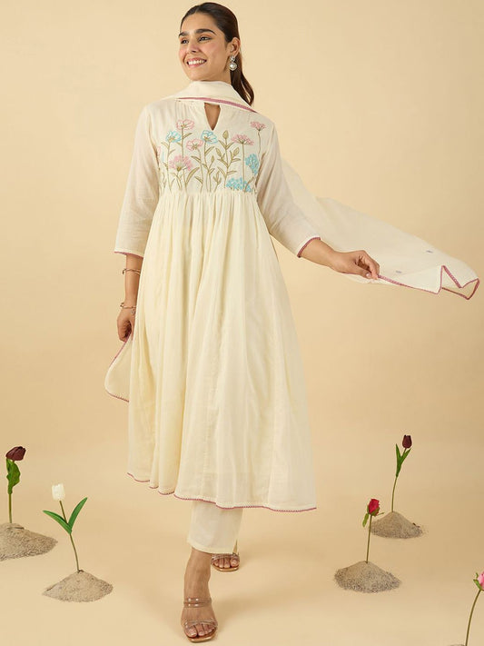 Dhiyona IE Floral Embroidered Pleated Pure Cotton A-Line Kurta With Trousers & Dupatta