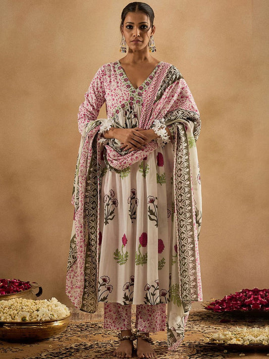 Dhiyona IE Floral Printed V-Neck Cotton Empire Anarkali Kurta With Trousers & Dupatta