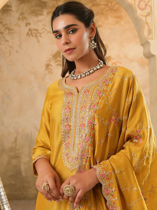 Dhiyona IE Floral Yoke Design Sequinned Velvet Straight Kurta With Trousers & Dupatta